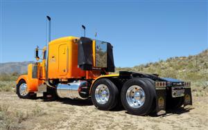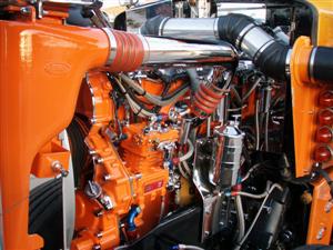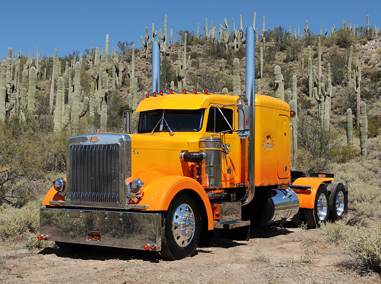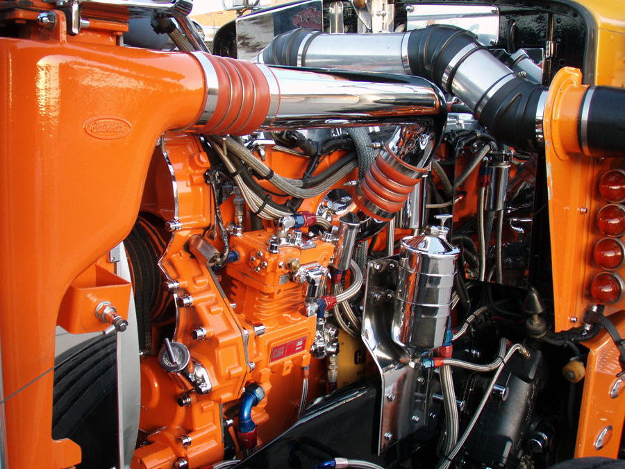In 2004, due to the impending emission regulations, Ron decided to re-power the truck with a newer engine. The Big Cam II 400 Cummins he had in it was still a good motor (and it had about 750 hp), so he sold it to help pay for the new one – a 1998 model 3406E Caterpillar with 550 hp. Before installing the engine, he had it powder-coated orange and then everything else was either painted, chromed or polished. Elias Bustamonte of Arizona Truck Specialists in Phoenix, a well-known Cat guru in the area, did all of the work. The job went pretty smooth, but he did have to make his own motor mounts and cut a hole in the firewall to accommodate the rear fuel line. At that time, Ron also installed a FASS fuel system to improve the new engine’s performance and efficiency. He also had to change the gearing in his rear-ends from 3.90 to 3.36 because the newer Cat ran at a much lower RPM than the old Cummins. Elias got that engine running and looking so good, Ron started thinking that it was getting time to redo the truck’s now fourteen-year-old paint job. But having just shut down for a few weeks to do the engine, he figured that he had better get back to work.