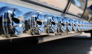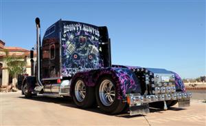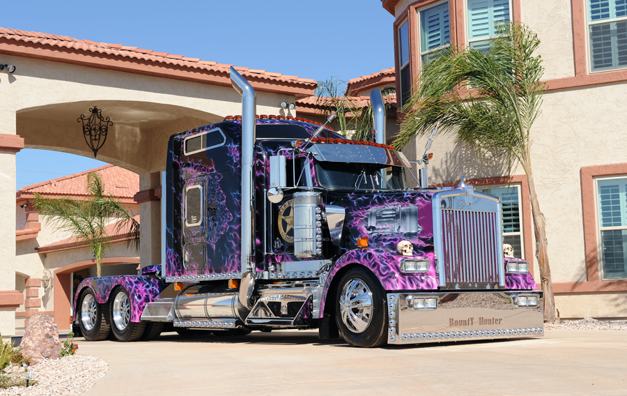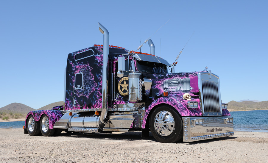 In addition to the exciting graphics and eye-catching colors, the “Bounty Hunter” is covered with lights and skulls. Featuring 280 various LED lights (214 of them have a plastic chrome skull cover) and 14 LED neon tubes, this truck looks pretty amazing at night. It also has custom wheel spinners, an eight-inch Dynaflex exhaust system and a Peterson Power Lift (hydraulic opener) for the hood. Up front, the truck has an American Eagle 22-inch stainless steel bumper, eight headlights (four of them are mounted in the bumper), a custom grille and two modified plastic skull piggy banks, mounted atop the fenders, with LED lights for eyes. The back of the truck features WTI fiberglass fenders, a one-piece deck plate and rear tail bar made by Mike at Roadworks, chrome air horns, and a crazy “Bounty Hunter” painted on the back of the sleeper with the phrase “Who Says Crime Doesn’t Pay?!” running across the bottom of the mural.