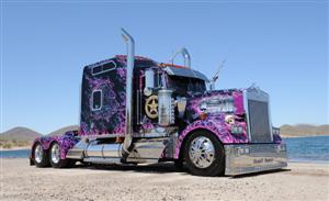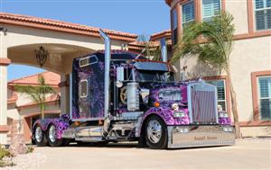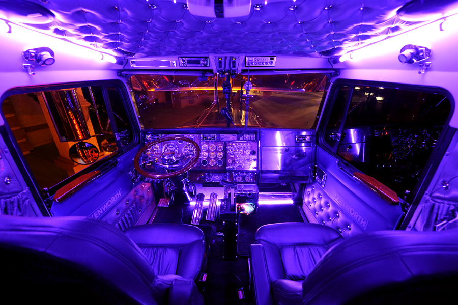 Inside the cab and sleeper, you’ll find a big stereo (of course) with 10 speakers and about 8,000 watts of power, several purple neon tubes, a GPS system, refrigerator, three flat-panel televisions and a ton of lights and chrome. The truck had a wood floor, but Jeff didn’t like it so they took it out. On the dash and throughout the cab there are sixty small purple LED lights, as well as jeweled toggle switches, and every button of the truck’s button-tuck interior (over 600 of them) has a chrome cover pressed over it. Future plans for the truck include a painted floor and dash, sprayed to match the exterior. Most of the accessories for the truck were bought at Danny’s Big Rig Resort in Phoenix, but a few of the pieces were purchased from 4-State Trucks in Joplin, Missouri. Jeff and Tom wanted to especially thank Pete’s Polishing, Terry at Truck Stuff, Jeff’s wife Crystal, Polly Trautman and Jerry Aufk for all of their help.