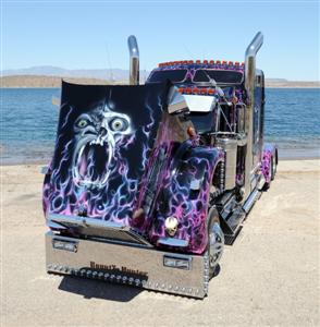 The first thing they did was take the truck to Fleet Painting in Phoenix to have the black base coat redone. After that, they brought it back to their shop where Hal Loo from the Mural Lab in Phoenix spent six weeks painting all the murals. After Hal completed his artistry, spraying flames and skulls and such using Candy Magenta, Cobalt Blue and Purple, the truck was taken back to Fleet Painting to be clear-coated and buffed out. Once all of the painting was complete, it was time to start hanging all of the extra accessories and installing all of the lights.