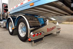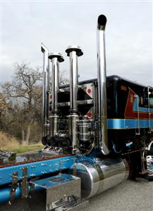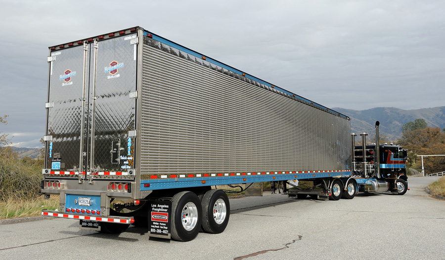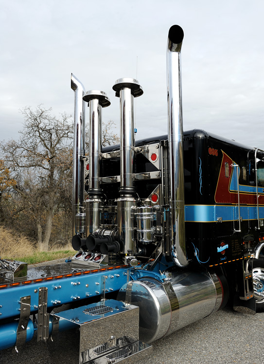 The trailer is a 53-foot 2011 Great Dane polished stainless reefer with sliding tandems. The rails are painted light blue to match the truck, and the TK reefer unit is painted maroon to match, as well. The landing gear have polished stainless steel supports and feet, while the back of the trailer has custom tail pieces, extra panels and plenty of lights. All the galvanized hardware was replaced with stainless steel, including the hooks for the doors and the chains, and a large aluminum box with stainless steel doors hangs underneath. Hooked together, this truck and trailer is a breathtaking combination!