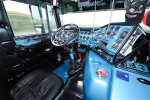 Although the truck was built “old school” (it has no refrigerator, microwave, inverter or television), it is very technologically-advanced inside, nonetheless – and it looks awesome, too! All of the gauges are digital and the floor, dash and doghouse cover are all painted light blue (done by Yannick Bonin and Stéphane Robillard). The door panels, headliner, sleeper curtain and winter front (bra) were all done in quilted black leather by Alain “The Snake” Chaussé, and then black leather Bostrom seats, on chrome bases, were installed. The kick plates are stainless, the steering column and Rockwood billet steering wheel were both chrome plated, and the door sills and armrests are polished billet aluminum. There are two small cameras mounted on the passenger side of the truck and a monitor in the cab so Andre can keep an eye on his blind spots, and he wired his reefer unit to a digital gauge in the cab that tells him the temperature inside his trailer and how much fuel he has left. He also has onboard scales with digital gauges inside that display the weights. The bed in the sleeper was shortened so Andre could slide his seat further back for more leg room. The final touch, inside, is a monogrammed (with his company logo) hand towel, hanging over each of the door handles.