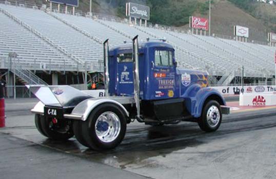 Called the "Junkyard Truck" because of the fact that it was put together with old parts from around their yard in Fontana, CA, John and Wayne Talkington's 1964 KW (below on left) not only beat the Twin Tornados (one blew an engine and the other a tranny trying to catch them) and CFI's Red Racer (below on right), but also set a track record on one of their runs reaching 110.52 mph with a time of 12.47 seconds. CFI's Red Racer did get up to 111 mph but couldn't beat the Talkington's time. Because they were bracket racing, Wayne found himself racing Allen Boles of Weaverville, NC in the final race. Wayne, who was handicapped by 7 seconds, had to sit on the line for what seemed like eternity before he could chase after Alan's 1993 Pete. Boles just barely beat Wayne with a .600 reaction time and an elapsed time of 20.192 at 69.78 mph. Wayne came off the line in .932 with a 13.977 ET at 102.98 mph.
