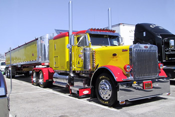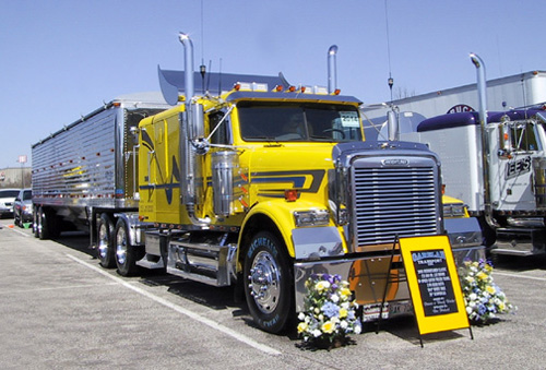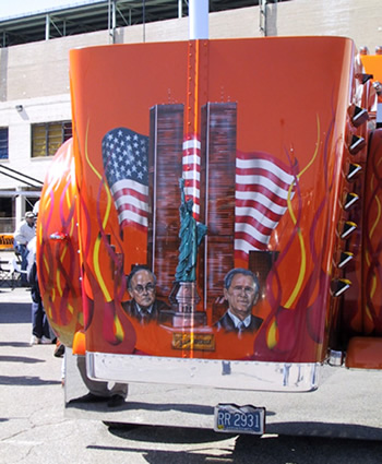 But for the latest, the hottest, the best in what people wanted to see in trucks, the action was in the parking lot. The 2nd Annual Paul K. Young Truck Beauty Championships, presented by Newport Communications as part of the Stars & Stripes series, featured 125 trucks – from brand spanking new off the dealer’s lot to incredible antiques – and everything in between. Some trucks featured amenities nicer than many homes – like a granite floor in AJ Leonhard’s 2000 Pete 379 or the custom cabinetry in Donnie & Diana Harper’s 2002 Pete – which also featured spectacular murals commemorating the events of Sept. 11th. These trucks really reflect the pride and passions of their owners - like the golf clubs carried on the deck plate of Buzz & Carol Sweeden’s 2001 KW “Simple Pleasures.” Or the Miami Dolphin’s motif carried out on Dan & Katie Kimball’s white & orange KW/Utility combo “Twice Upon a Dream.”