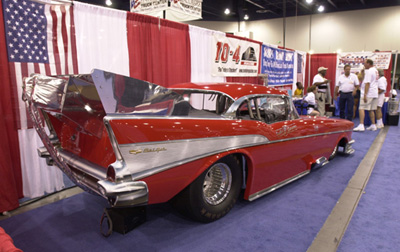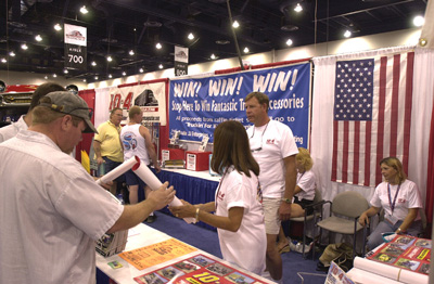 But we never could have done it without the help of some special people. First and foremost, we’d like to thank Jerry and Gayle Jeffries of Double JJ Enterprises in Anaheim, CA. Not only did they donate two sets of Double JJ blinker bars and rear step blinkers to raffle off, but they also brought their unique two-seat funny car to display in our booth. With 50s music playing on the radio inside, this awesome bright red 1957 Chevy attracted a lot of attention and got many to stop at our booth - not to mention the tireless efforts of Gayle who wouldn’t let anyone walk by the booth without hearing her sales pitch. That girl, as well as Jean, Shannon, April and Debbie, worked hard!