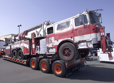 The procession of vehicles on the "California Journey" included two trucks (one with the fire truck and one with the steel), four support cars and a CHP escort in the front and the back (sometimes there was two CHP units in front and two behind). Going down the highway, this convoy created quite a stir wherever it traveled. Donnie Harper and his orange 9-11 Pete (featured on our September 2002 cover) pulled the drop-deck trailer with the fire truck on it, while his wife Diana drove a daycab Pete (donated by Hill Crane Service) and pulled the steel. Diana took a beating driving that little truck, and should get some special recognition for the fine job she did.