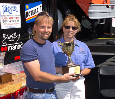 COMBO - 1st: Sandvik Trucking/Bill Sandvik – 1998 White & Blue Peterbilt 379/1993 Ravens Flatbed; 2nd: McLane Transport/Mike Haertling – 1997 Red & White Kenworth W900L/1998 Great Dane Reefer “Mad Max”; 3rd: Rod & Kim Grimm – 1999 Blue & Black Kenworth W900L/2001 Utility Reefer “Illusion”; 4th: CTR Trucking/John Testa – 2002 Black Cherry Peterbilt 379/2003 Rogue Transfer Dump; 5th: CBF Trucking/Clarence Falk – 1998 Purple Muraled Peterbilt 379/2003 Great Dane Van.