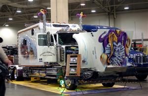 In the Pride & Polish area, more was going on than just the display of incredible show trucks. The second annual “Big Rig Redo” generated a steady stream of curious traffic as four Freightliners (the event sponsor) were customized by teams from Texas Christian University or the Art Institute of Dallas. With a budget of $1500 per truck and the chance to earn a $2,000 scholarship for their school, the teams worked tirelessly to transform ordinary interiors into something really special. Four different themes were chosen by the teams and the winning trucks. Ron Shifflett’s wife Marcia entered his truck to surprise him. When his cell phone rang one morning to tell him his truck was going to be redone, he had no idea what a big project it would turn out to be! His 1997 Freightliner FLD120 with a Classic interior was morphed into a tropical beach themed oasis, complete with grass-skirted lighting, sea shells, leaping dolphins on the seats, and a night sky filled with stars. The Shiffletts took the opportunity to enjoy a long-delayed honeymoon – celebrating 13 years of marriage. Their truck received several awards for design, creativity and use of budget.