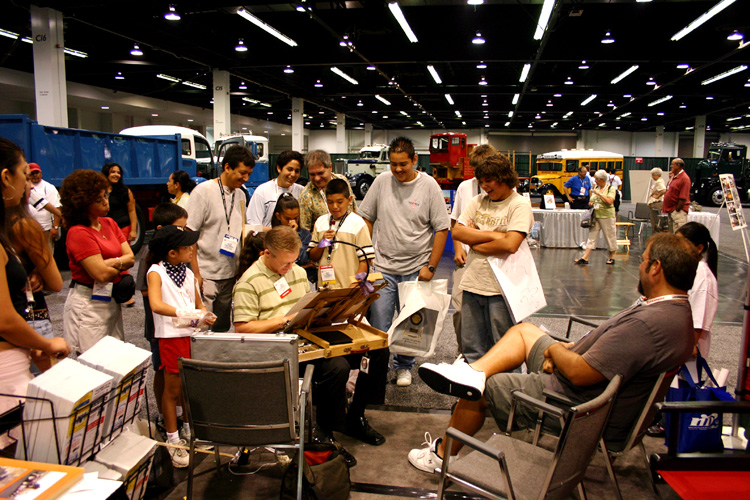 Of course, over in the 10-4 booth, our crew had a lot of fun handing out free posters, centerfolds, magazines and t-shirts to everyone passing by. We also had our resident artist Greg Dohlen drawing amazingly funny caricatures for anyone who was patient enough to wait. On Saturday, it got so crowded that we had to hand out numbers to those who were waiting. It was like being at the post office, hoping for your number to be called. Many of our trucking friends stopped in to chat with us for a while or just say a quick hello. We’d like to thank everyone who came by our bright red booth and helped make our experience at ITS 2004 a good one.