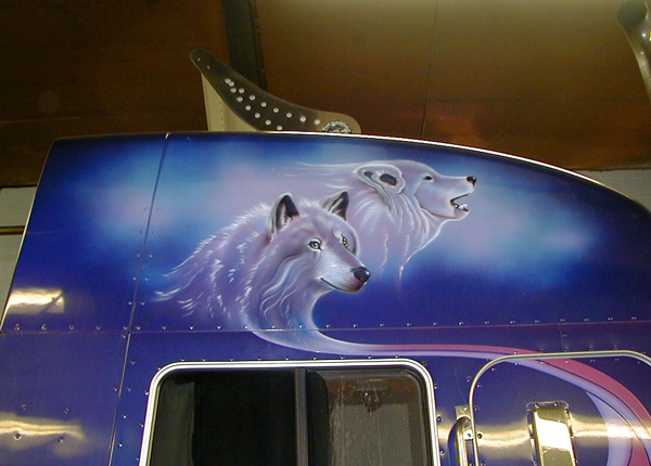 Two beautiful white wolves, painted high on the sides of a high rise double bunk extended hood Pete painted dark blue, have been cruising the highways between Grand Rapids, Michigan and Salt Lake City, Utah for 900,000 miles. But the two wolves are hungry. Having been stuck in the right lane with an underpowered 12.7 liter Detroit with 430 horsepower, these wolves have had to watch the Cats go by in the hammer lane for a long time. It seems there are Cats everywhere, but none for the hungry wolves to eat. The Detroit wolves were forced to breath through dual Vortox stainless air cleaners, and just couldn’t get rid of their exhaust fast enough because of ultra-quiet, choking mufflers. The beautiful wolves had never had the pleasure of hearing the sweet melody of their own free-flowing exhaust.