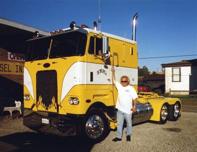 This beautiful bright yellow 352H Pete (pictured below) was one of the sisters. Its new owner is John Ternenyi of Hollywood, California. John found her in a used trailer lot in Fontana, CA and paid $10,000 for her. The engine was converted to a KTA 600 by one of the previous owners, so all John had to do to the engine was install a high-flow fuel pump, injectors, turbo and a turbo boot to produce in excess of 800 horsepower. This is the original engine in this Pete. John painted the truck, installed new rear fenders, had Shepard Power Steering rebush the entire truck and add new shocks, air bags, shackles and hangers, and then installed extra low profile tires to get the low rider look. And LOOK it does. This is one sharp cabover and John has every right to be proud of his truck. And what kind of work do you think he gets to do with this truck? He pulls trailers for the motion picture industry loaded with cameras, props and grips.