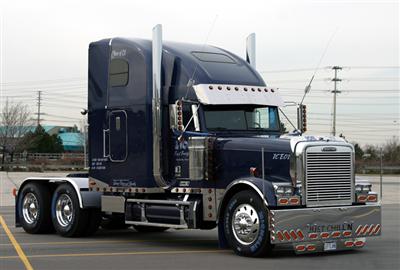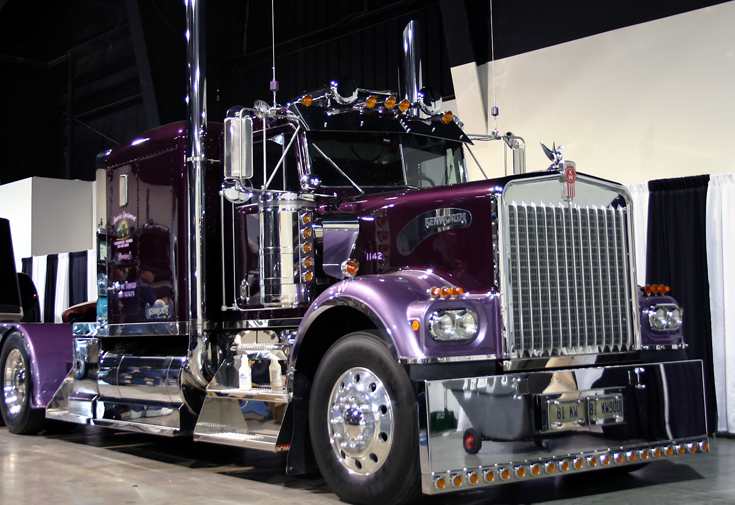 Gary and his wife, Jennifer, have spent the past two years modifying an eye-catching Peterbilt 379. They narrowed the hood by 6", extended it by a whopping 10", dropped the roof of the cab by 3" and the sleeper by 5", removed all the exterior door handles, and created custom stainless pieces to emphasize the loooooong, lean look. The interior is still a work-in-progress, but Gary expects that within the next month, the cherry wood floor, stainless steel dash panels and black leather interior will be complete. The stunningly good-looking truck drew many appreciative visitors. Their fledgling aftermarket stainless accessories company is based in New Dundee, Ontario, Canada and they are hoping to expand distribution into the U.S. In the meantime, Gary hauls office furniture parts and LTL freight to Southern California, and LTL back to Toronto.