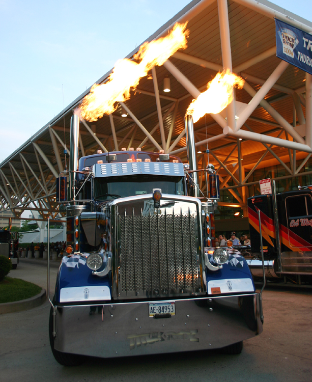One of the highlights of this show came right outside the Convention Center as Truk-Rodz by Jones Performance fired up two of their highly customized tractors and filled the night sky with flames shooting high into the air from their stacks. Truk-Rodz produces replacement hoods for all makes of Class 8 tractors, from OEM to totally customized. Their trucks put on quite a show, choreographed to music being blasted from their mind-blowing stereo system.