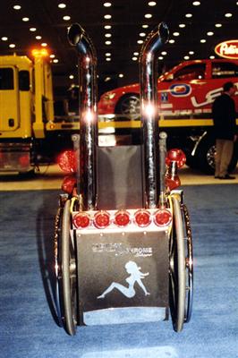 The reason I started this article with the word MOBILITY is because the disk jockey called “The Truckin Bozo” that airs on the clear channel, has been stricken with diabetes, and now must be in a wheelchair. Carol Watson and her crew from America’s Truck Wash & Chrome Shop in Tridelphia, WV, decorated a special chair for the Truckin Bozo. This chair has twin 4” chrome stacks, LED lights (powered by a motorcycle battery), and a mud flap with a chrome silhouette of a lady and a chrome weight across the bottom. The Bozo will be proud to be in this chair (see photo).