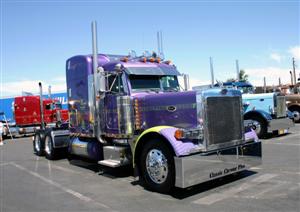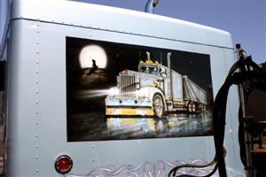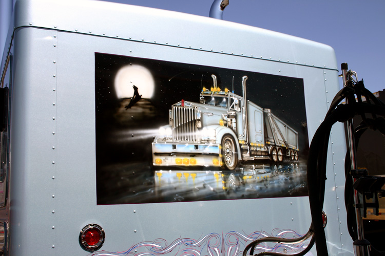 Late Saturday afternoon, the awards were presented in a tiny little area (not even a room) at the Silver Legacy Hotel & Casino. With seating for about 120, some 200 or more people showed up. The crowd made quite a scene at the hotel. This year’s standouts included Mike Maggini’s yellow and green Pete, Rod Pickett’s slammed black Pete, Western Distributing’s uniquely-painted 1954 KW, and several trucks with murals depicting Pirate ships, trains, cows, flames, trucks, flags, dragons and howling wolves. Featuring what seems to be the latest trend, many trucks had less chrome and lights, and more painted accessories like visors and air cleaners. Trevin Frederiksen’s orange and purple Pete is a good example of this new style that is rapidly gaining popularity.
