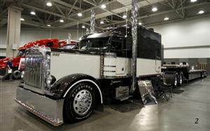 Participant Wayne Baker, who brought his 2002 black and gray Peterbilt 379 and a Utility reefer, had a couple of surprises in store for him. A late-night trip to the emergency room with kidney stones made it impossible for him to attend the awards ceremony. His truck, which was featured on our cover when it belonged to Jeff England of Pride Transportation, looked fantastic – in fact he was awarded two trophies, including first place in his class and a second place for his engine. When his name was called as a class winner, he was on the cell phone with his wife, Darlene. She was delighted to share the good news with him, and all the attendees cheered loudly enough for him to hear! To look at some of these trucks, you’d swear they never turned a wheel on dusty roads or grease-laden parking lots. Wrong! Most of these trucks run back and forth across the country on a daily basis, earning a living for their owners and drivers. These folks just take the extra time to keep their trucks (and themselves) looking tall. BOBTAIL (1998-2000): 1st (tie) Thomas & Maryann Quick AND John Schmitz; 2nd (tie) Cindy Stowe AND John Wesley Perry. BOBTAIL (2001-2002): 1st