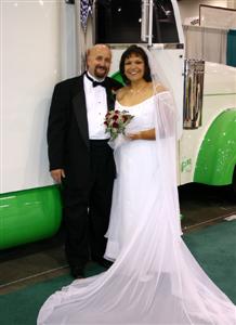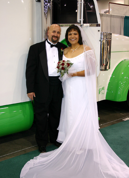 This year, like last year, we were happy to have the crew from 4-State Trucks in Joplin, MO and their cool “Mob Sled” show truck right next door. That white and lime green bad boy attracts lots of attention! And what Las Vegas show would be complete without the talents of Greg Dohlen drawing those caricatures? Greg has been doing the show with us for years, and we wouldn’t have it any other way. Many people come to our booth every year just so they can get drawn by Greg again. Needless to say, we were pleased with the show and hope the heavy-hitters get back on board next year. On day two (Friday) of the show, we had some interesting visitors come to our booth. What is it about truckers wanting to get married at truck shows? Especially in Vegas! Well, it happened again. Richard & Maria Baulos of Flint, Michigan tied the knot in ICT’s booth on Friday afternoon and then spent the rest of the day walking around the show posing for pictures. Yes, even we got into it (photo 1). With Richard in his black tux and Maria in her white gown with a long train, the couple wandered around the show while their photographer (and many others) snapped picture after picture. Our congratulations go out to the happy couple - we can guess where you’ll be spending your anniversaries.