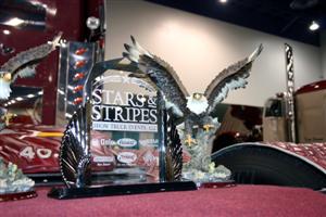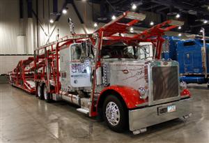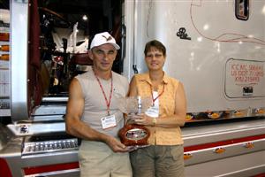 BEST THEME: Prizm Express/Mike & Michelle Miller – 2004 Pearl Blue Pete 379 & 2005 Western Elite Flatbed. BEST USE OF CHROME: Spider Transport/Mont Boardman – 2004 Silver & Red Pete 379 & 2004 Cottrell Auto Transporter (photo 2). BEST OF SHOW (LIMITED MILES): (tie) Gailand Johnston of Lamar, MO (photo 4) – 2003 Copper & Silver KW W900L AND Pacific Truck & Trailer/Richard & Sara Sweider of Grants Pass, OR – 1981 Red Pete 359. BEST OF SHOW (BOBTAIL): Ron & Jan Huey (photo 3) of Greensburg, IN – 2000 Silver Metallic Int’l 9400. BEST OF SHOW (COMBO): Maggini & Son Trucking/Mike Maggini of Riverdale, CA – 1988 Yellow Pete 379 & 2002 Utility Flatbed (photo 5). Copyright ©