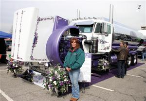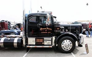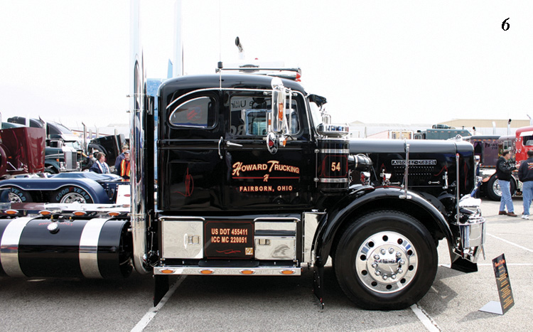 Notable newcomers included Vinnie Diorio, Frank “Pug” Pugliese, Mike Bedeker and Erica Eby. Vinnie’s orange and grey Pete 379 and matching Mac curtainside trailer were lookin’ real good, as well as Pug’s two-tone blue Pete 379 and custom Great Dane covered wagon. Mike Bedeker of A & R Trucking had an awesome black Pete with custom headlights and brackets, as well as a host of other unique items. Erica Eby of Stevens, PA won 1st Place in the Limited Mileage Bobtail class with her white and purple Pete 359 tanker adorned with hand-painted flowers (photo 2). Her truck was the ladies favorite – and obviously the judge’s as well. Not a newcomer himself, but Pat Eilen had a new white and lime green Pete with a matching polished end dump on display called “Iron Outlaw” that earned him three 1st Place awards (photo 3). This year a new People’s Choice award was added. Attendees, exhibitors and fellow competitors were all welcome to vote for their favorite truck on the lot. And, just as the folks from Stars & Stripes had hoped, the winner of this coveted trophy had not won any other award. Jerry Howard of Fairborn, OH and his 1954 Autocar took home what many feel is the best award of them all (photo 6). And judging by the crowds surrounding this truck every day, we were not surprised when Jerry’s name was called.