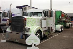 2005 & NEWER (BOBTAIL): 1st Rick Hitchcock of Webberville, MI; 2nd Bruce & Marilyn Barnes of Troy, MO; 3rd John Dietz of Dillsburg, PA. NEW TRUCK - UNDER 50K MI (BOBTAIL): 1st Jerry Roth of Crawfordsville, IA; 2nd James Johnson of Hemingway, SC; 3rd Ray Elvis of Hemingway, SC. INTERIOR (CAB ONLY): 1st Pat Eilen of Hampton, MN; 2nd Dale Lambrecht, Jr of St. Peter, MN; 3rd Truett Novosad of Caldwell, TX. INTERIOR (OEM SLEEPER): 1st (tie) Harvey & Karen Zander of St. Louis Park, MN and Russ & Debbie Brown of Moore, OK; 3rd Glen Horack of Elkland, MO. INTERIOR (AFTERMARKET SLEEPER): 1st (tie) Leonard & Charlene Testerman of Frederick, MD and Darian Stephens of Hereford, PA; 3rd Tommy & Kim Turner of Cynthiana, KY. ENGINE: 1st Bob & Shelley Brinker of Grayling, MI; 2nd Ronnie Johnson of Troy, MO; 3rd (tie) Harvey & Karen Zander of St. Louis Park, MN and Darian Stephens of Hereford, PA. PAINT/GRAPHICS (COMBO): 1st Pat Eilen of Hampton, MN; 2nd Darian Stephens of Hereford, PA; 3rd Paul Stanchio of Port Washington, NY. PAINT/MURAL (COMBO): 1st Mike Penrod of Fargo, ND; 2nd James Speich of Janesville, WI. PAINT/GRAPHICS (BOBTAIL): 1st Dale Lambrecht, Jr. of St. Peter, MN; 2nd Randy & Jona Rebillard of Gimli, Manitoba; 3rd Truett Novosad of Caldwell, TX. PAINT/MURAL (BOBTAIL): 1st Bob & Shelley Brinker of Grayling, MI; 2nd Harvey & Karen Zander of St. Louis Park, MN; 3rd Russ & Debbie Brown of Moore, OK. LIGHTS (COMBO): 1st Darian Stephens of Hereford, PA; 2nd Paul Stanchio of Port Washington, NY; 3rd Tommy & Kim Turner of Cynthiana, KY. LIGHTS (BOBTAIL): 1st Harvey & Karen Zander of St. Louis Park, MN; 2nd Russ & Debbie Brown of Moore, OK; 3rd Matt Baenziger of Kingston, IL. BEST THEME: Russ & Debbie Brown of Moore, OK – 1999 Black & Orange Freightliner Classic (American Thunder). DIESEL DAVE’S PICK OF THE LITTER: Harvey & Karen Zander of St. Louis Park, MN. LIMITED MILEAGE (COMBO): 1st TDT, Inc./Clint Dicks of Lake City, FL; 2nd A & R Trucking/Mike Bedeker of Morris, IL; 3rd John Ray Enterprises/John & Kay Ray of Eastaboga, AL; 4th Frank Pugliese of Portage, IN; 5th Hoffman Transportation/Ron Baird of Thorntown, IN. LIMITED MILEAGE (BOBTAIL): 1st Erica Eby of Stevens, PA; 2nd Bill & Marie Sandvik of Valley Center, CA; 3rd Rob Gentry of Fulda, IN; 4th Wayne Hollingsworth, Jr. of Oxford, AL; 5th Darin Bean of Maceo, KY. BEST OF SHOW (COMBO): Leonard & Charlene Testerman of Frederick, MD – 1983 Red Peterbilt 359 & 2004 Reitnouer Step Deck (Rollin’ Thunder). BEST OF SHOW (BOBTAIL): Harvey & Karen Zander of St. Louis Park, MN – 2003 Blue International 9900ix (Icy Blu 2). 2ND ANNUAL BIG RIG BUILD-OFF CHAMPION: ACW Specialties/Adrian Rocamontes of San Antonio, TX (Sledgehammer). PEOPLE’S CHOICE: Jerry Howard of Fairborn, OH – 1954 Black Autocar. Copyright ©