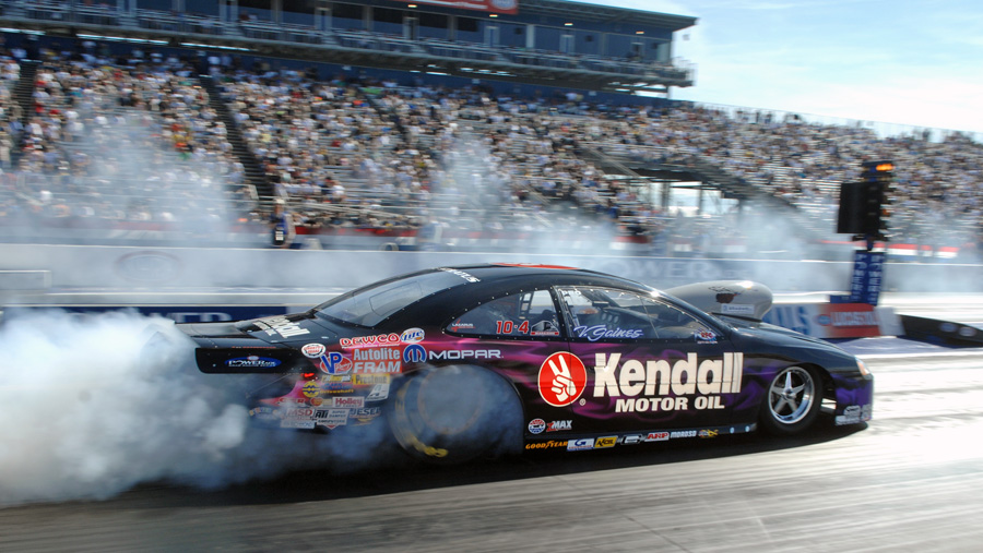 Gaines began in the Sportsman Series, and eventually moved up to the Pro Stock class. To him, due to the fact that pro stock racers rely on what some call “all motor” power because no turbochargers or superchargers (or any other quick-horsepower methods) are used in the series, he considers this class to be the purest form of racing. The car’s engines are limited to a 500 cubic-inch, naturally aspirated set up. V’s Kendall Oil Dodge Stratus features a complete carbon-fiber MOPAR body, a chrome-moly tubular chassis, a 500 cubic-inch Dodge Hemi with two four-barrel Holley carburetors and a 5-speed gearbox. Gaines never touches the clutch, except at the starting line, when he releases it to get the car moving. Shifting is a straight forward and back, non-H pattern, style. Pumping out 1,400 horsepower, the car can go 0-210 mph in 6.60 seconds.