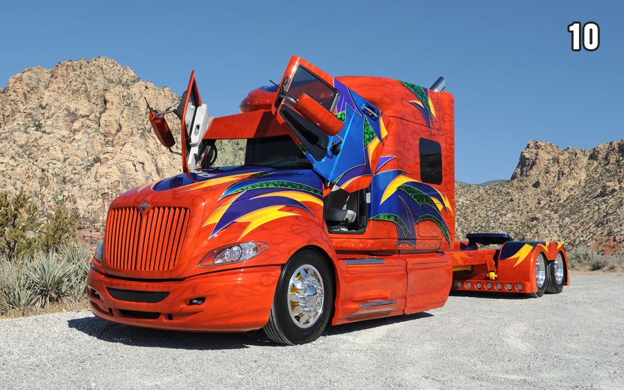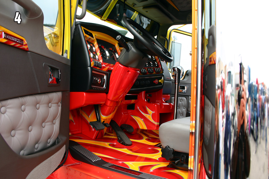 One of the things ETC is known for is their amazing interior work, and several of their rigs illustrate that fact perfectly. “Hillwick 66” is a 1966 narrow nose Peterbilt with a killer interior that includes extensive amounts of Zebra wood that was imported from Brazil. The “Punisher” Kenworth, which was on our September 2009 cover, also has an awesome interior, as does the “Mayhem” International, which was featured on our August 2008 cover. There have been so many trucks it is hard to mention them all, but a few of the more well-known rigs include the “99 Problems” red Peterbilt, the “G-Unit” two-tone blue Peterbilt, the orange and purple “Hot Wheels 2” Peterbilt car carrier, the blue and black “Bruizer” Freightliner, and the ultra-cool Candy Red “Bad Habit” International LoneStar. A few of these trucks have made our cover, as well.