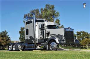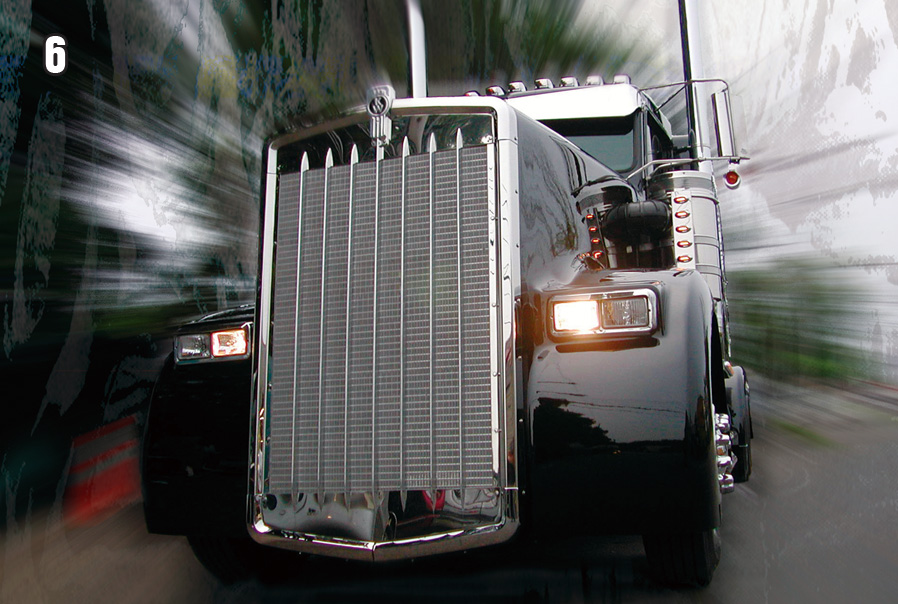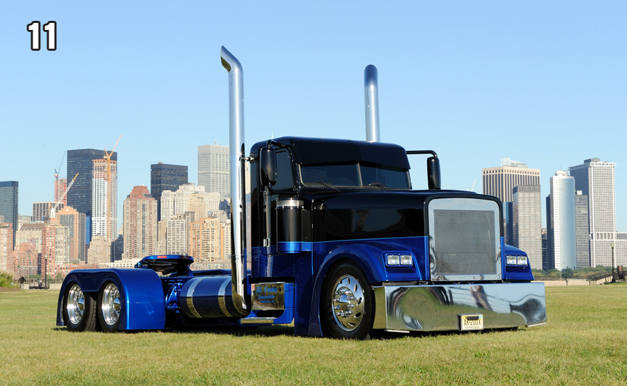 PHOTOS: 1) Steve Sr. & Deborah Pesce; 2) The group pic taken when ETC won the 2005 Build-Off; 3) Steve Sr. & daughter Kim; 4) “Tequila Sunrise” KW interior; 5) “Hillwick 66” Peterbilt interior; 6) “Predator” KW; 7) “Punisher” KW; 8) “The Beast” Peterbilt; 9) “Bad Habit” LoneStar; 10) “Mayhem” ProStar; 11) “Bruizer” Freightliner with the skyline of Lower Manhattan lurking behind.
