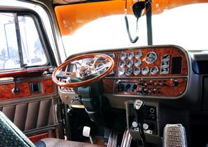 However, what is perhaps one of the most extreme changes to the truck is the sleeper. It, to many, probably just looks like another Peterbilt standup sleeper. But, on closer inspection, you’ll notice it is quite a bit shorter. Ramon and his son, Ramon Jr., chopped an entire 7” off the sleeper height, which now rises only slightly higher than the cab. The exterior of the truck was finished off in one last, loud note, when Ramon added double-hump rear fenders that were airbrushed with skeleton bandits toting smoking shotguns. All of the airbrush work was handled by close friend Pedro Gutierrez. At the tail end of the truck is a nice, polished rear light bar. Ramon’s truck, which is powered by a 550 horsepower Cat routed through an 18-speed transmission, sits on a 270” wheelbase. The interior of Ramon’s truck is no less understated than the exterior. Featuring copious amounts of wood, including a hardwood floor he and his son installed, the inside also features a full set of chrome gauges, a polished steering wheel and alligator-skin seats, too.