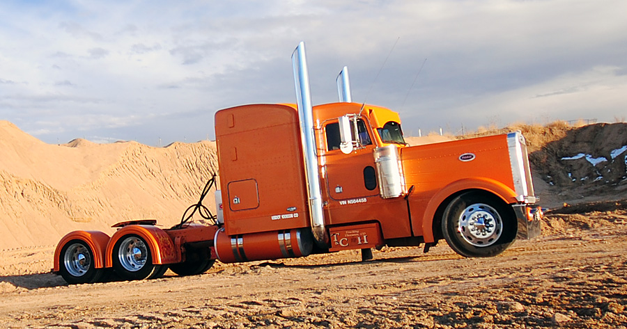 Though Ramon sometimes hauls interstate freight, the majority of his work is local to the Denver area, being that he is based in Thornton, Colorado. Pulling a half-round end-dump trailer, Ramon hauls sand and gravel, as well as larger types of aggregate and rock. Hauling in and out of the pits can put his truck in some tight and rough places. But, these obstacles do not bother him or slow him down – it is just what needs to be done to accomplish his job. And that’s not idle talk, either. Our photo shoot location was one of the sand pits that he hauls out of, and I got a front-row seat to his driving abilities.