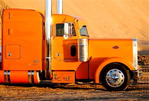 Ramon’s truck is no ordinary “dump” truck. When Ramon began building the truck, he didn’t want it to have a particularly subtle look, and it doesn’t. The bright orange truck, which began its life as a stock 2001 Peterbilt 379, features many impressive and over-the-top parts and work. The rig’s most noticeable modification is the bumper-mounted headlights. Set into a 20” American Eagle bumper, the 359-style double round headlights certainly give the truck an outlaw look. Moving back, the truck also features drop front fenders and a drop visor, similar to the one used on Outlaw Customs’ “Vigilante” rig. There is not a lot of chrome on this truck, but what there is, it is big – the shiny air cleaners are followed by 10” Dynaflex pipes that are nearly the same diameter! Other features of the truck include painted sleeper and cab extensions, as well as painted step boxes and fuel tanks.