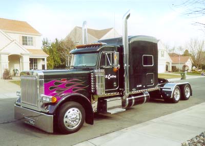 available in the Chrome Illusion line, which changes color depending on how the sun is hitting it. The graphics were done by Ed Fuhrer Paint Works in Antioch, California. An artist named Basil Platt finished the job by outlining everything and laying down the pinstripes. This truck is one-of-a-kind and Bill is very proud of it. Hauling two loads of cheese daily between Turlock and Hayward in his 2002 stainless steel Great Dane reefer trailer, Bill is able to keep the mileage on his rig low and be home every night. Driving for about ten years, this young trucker (38) loves to be different - and his truck reflects that. Unfortunately, he isn’t able to take much time off so he rarely can attend truck shows. I guess that’s good news to all his would-be competition! To see this truck in color, check out our website at www.tenfourmagazine.com. Thanks Bill.