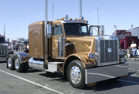 MARC'S LONG TIME LOVE AFFAIR This month's Readers And Their Rigs is a love story. Marc Simpson (39) of Escondido, California, fell in love with this truck back in the mid-1980s when he first saw it. A guy named Gil owned the truck and took great care of it. Over time, Marc lost touch with Gil and didn't see him or the old Pete for years. Four years ago Marc signed on with Sandvik Trucking and at his first pickup saw Gil and the old Pete. After catching up, Gil informed Marc that he was looking to upgrade. Marc passed this information on to the owners of the company (Bill & Marie Sandvik) and they bought the truck. Marc, with the help of Bill & Marie, fixed up the truck, but made sure to keep it original. The truck's color scheme (metallic brown with cream-colored graphics) and overall look is indicative of trucks of its era. Marc didn't want it to look like a "show truck" but instead a nostalgic rig. Except for the bumper, half fenders, some LED lights, dual breathers and nickel-plated stacks, the truck is stock and original. Marc says that the old 1984 Pete 359, which has a 63-inch flat top sleeper, 425 Cat, 13-speed tranny and "Classic" interior, gets just as many looks at the shows as the fancy new trucks. Unfortunately, Marc doesn't get to drive it on his regular run (California to Arizona and Nevada with tile and granite) because the truck, which has over 2,000,000 miles on it, is too small and under-powered. But he does get to take it to the shows. Marc is very particular about who he lets drive the truck - so particular that he often wonders why Bill & Marie haven't fired him yet (after all, it is their truck). After a lifetime of driving, Marc believes this will be his last job. Not only does he love this truck, but he loves working at Sandvik - so he ain't going anywhere soon! |
