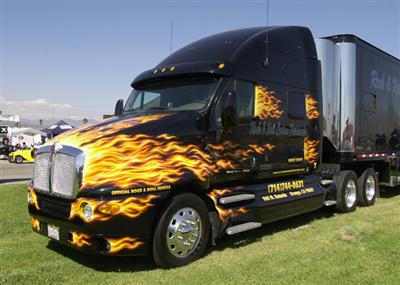 Official “Rock & Roll” Vehicle This month’s Readers and Their Rigs comes to us from Rock & Roll Custom Paintworks in Orange, California. Owner Randy Morton recently built this cool 2003 Kenworth T2000 to tour the country and promote his business, which designs and paints some of the hottest vehicles around. This truck vividly illustrates the type of work that Rock & Roll is capable of doing. Although specializing mostly in motorcycles, they also paint hot rods, helmets, boats, jet skis, guitars, and trucks. In business for over 25 years, Randy’s shop is one of the ten largest custom bike paint shops in the United States. Randy purchased the KW in early 2003 and immediately went to work. Over one single weekend, his team of nine painters basically completed the paint job on this unique truck, which features realistic yellow and orange fire and skulls. Powered by a “tweaked” Cat 550 and a 13-speed tranny, the truck has plenty of “fire” under the hood. After finishing the paint, the truck, which pulls a custom Featherlite trailer, spent three months out on the road attending major bike and hot rod shows throughout the country. Each year, Randy and his crew attend some 35 shows. All their inventory and toys go in the truck (driven by Perry, a veteran truck driver), and then the crew flies in for the show. Afterwards, the crew flies back home and Perry heads to the next event. Painted on the side of the sleeper are Randy’s true feelings about his company and truck, boldly stating, “The Surgeon General Says Nothing About Smoking the Competition!” If you’re looking for an experienced shop to give your rig (or bike, or boat, or rod) a wild custom paint job, give the guys at Rock & Roll Custom Paintworks a call today at (714) 744-0631 or visit their website at www.rr-custompaintworks.com. |