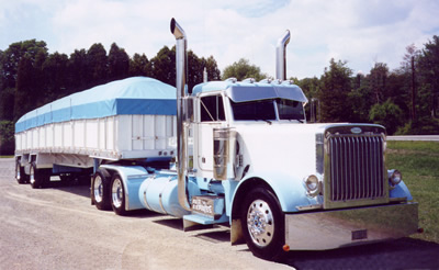 STEEL This month’s “Readers And Their Rigs” comes to us from Chris Riggle (31), an owner operator from Apollo, Pennsylvania. Chris bought this 1988 Pete 379 four years ago from a guy in California. Back then, the truck was dark blue with silver stripes and had a stand-up sleeper. Chris immediately began fixing up the rig. Liking the “Day Cab” look and not needing a sleeper, Chris removed it and began tricking out the truck. He painted the cab and hood with a pearl white paint and the fenders (front and rear), the tanks, the steps, the roof portion of the cab, and the frame a light powder blue. The color combination is quite unique and very eye-catching. Everyone thought Chris was crazy when he added 8-inch stacks but he really liked them. He also added a lot of custom stainless, LED lights with clear lenses, and lowered the rig. The truck is powered by a 425 Cat and has a 15-speed transmission. Hauling steel on a 1997 Reitinour flatbed fitted with a white side kit and custom (matching) powder blue tarp, Chris runs locally around Pittsburgh, PA. Driving for eleven years now, Chris began working at his family’s trucking company when he was 20 years old. Four years ago he bought this truck and became an owner operator. Chris is a third-generation trucker who loves driving but refuses to drive anything that he isn’t proud of. Obviously, he’s proud of this truck. Chris picked up a copy of 10-4 at the Palmdale Truck Drags last year and really enjoyed the magazine. He liked it so much, he signed up for a subscription. Thanks Chris - we hope you especially enjoy this issue. |