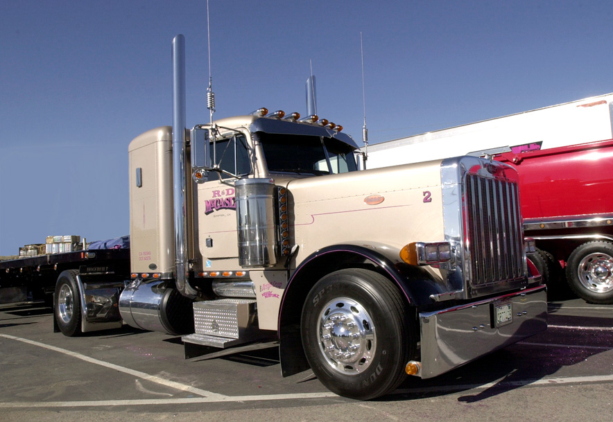 "WILL WORK FOR CHROME" This month’s Readers And Their Rigs comes to us from Owner Operator Robin McCaslin (38) of Shafter, California. Robin has only been trucking for five years, but has already made a name for himself, hauling hay from El Centro to Tulare with a beautiful 1999 Pete 379 pulling a set of 1999 Utility flatbeds. Purchased as a new glider kit from a local Peterbilt dealer, Robin added a 470 Detroit Diesel engine, a 13-speed transmission and 3.21 rear-end. The truck is painted Mocha Pearl with black fenders, and features pink lettering and pinstripes. The trailers are painted Black Cherry - a color Robin eventually wants to apply to his frame rails and fenders. Across the back of his trailer reads Robin’s motto, “Will work for chrome!” The clean Pete also sports a short 36-inch sleeper which gives Robin a place to nap while on the road. Inside, the rig has a booming stereo system, installed by The Design Group in Bakersfield that includes three 12-inch woofers. Much of the chrome and accessories on this truck came from The Chrome Shop in Arvin, another one of Robin’s sponsors. He also had his windows tinted dark by Krazy Kustomz in Bakersfield. In fact, Robin sometimes has them tint his front windshield for some of the shows he attends (of course he peels it off after the show ends, before he drives home). Robin’s family was involved in sugar beet farming, so Robin grew up around farms and trucks. For years, he drove a sugar beet harvesting machine and loaded trucks out in the fields. That’s where he met guys like Fred Rivera and Tony Martinez, and fell in love with their trucks. Now that he has made the switch to trucking, he never wants to go back. More than anything, Robin loves going to the local California truck shows and taking his 11-year old son Mason with him. |