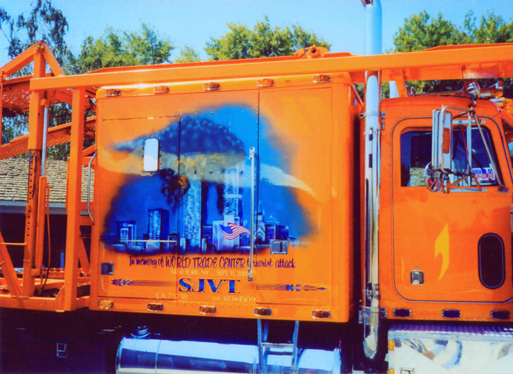 A ROLLING MEMORIAL AND TRIBUTE This month’s Readers and Their Rigs comes to us from Grant & Helen Ford of Merced, California. After the 9/11 terrorist attacks, Grant and his wife wanted to do something to help people remember the events of that fateful day, so they had their 1984 Pete 359 decked out with memorial murals depicting the two scenes of that day. One side has a mural of the Pentagon with a plane slamming into the building and the other side has a picture of the two World Trade Center towers burning - an image none of us will soon forget. Grant & Helen can’t believe all the attention they get out on the road. People stop them to take pictures, drive along side them, give V signs and thumbs up, and crowd around the rig at truck stops and wherever they go, praising the idea and the beautiful work and detail the artist did on the murals. The Modesto Bee newspaper even came out and took pictures of the truck for the 9/11 edition of the paper last year. The bright orange 10-car hauler, which features a 301-inch wheelbase and an 84-inch sleeper, is in excellent shape, and the Ford’s are very proud of it. Running mostly in California, Grant & Helen have been owner operators since 1976, hauling automobiles under the name San Joaquin Valley Transport. They also own a few 7/11 stores. Grant retired from the USAF back in 1976 and immediately began trucking. The Ford’s expressed a desire to form or be a part of a 9/11 club for people who have used their trucks to show honor and tribute to the tragedy. If anyone out there is interested, please contact the magazine at 1-888-440-4104. |