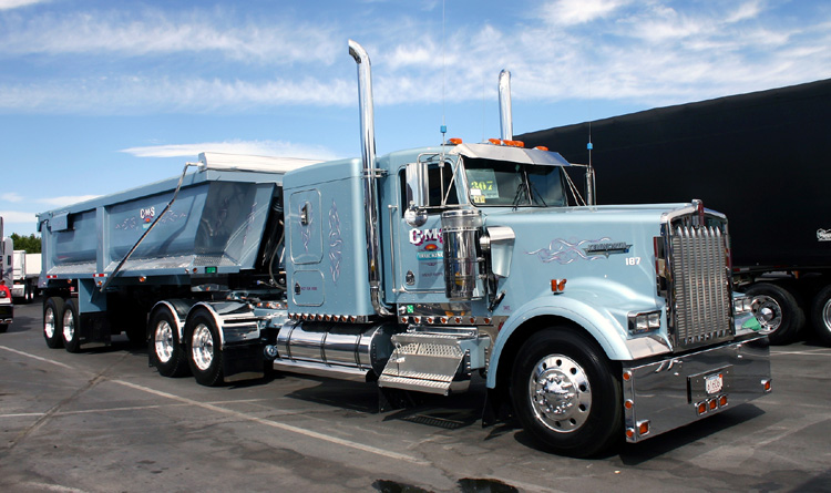 Clean KW Lives A “Charmed” Life This month’s Readers And Their Rigs comes to us all the way from Cape Cod, Massachusetts. Chris Schmidt of Wellfleet, MA owns and operates the beautiful 2003 Kenworth W900L pictured here, hauling sand, stone and other landscaping products to the two golf courses that his family owns - one on the West Coast and one on the East Coast. Chris admits that his ride lives a charmed life, being garaged or “on vacation” during the cold season out West. In fact, this truck has never experienced snow or road salt at all - and that’s the way Chris likes it. Featuring ample amounts of chrome and stainless and a neat mural (a picture of the truck under a moonlit night sky) on the back of the sleeper, the pristine light metallic blue rig, equipped with a 565 Cummins, 18-speed transmission and 3.55 rears, hauls either decorative stone in the Ravens dump trailer pictured here or sand, mulch or bark in an aluminum trailer he owns that is designed for lighter loads. Growing up in a construction/landscaping business environment, Chris has been around trucks and trucking most of his life. Early on, Chris knew that he wanted to drive a truck, and in 1992 he went to work for a long-haul operation where he traveled a million accident-free miles over the next eight years. In 2000, his father convinced him to come and work at the family business and that is what he still does today. Golf courses, as you might imagine, need a lot of constant maintenance, and its Chris’ job to make sure that all of the necessary materials arrive safe and sound. The truck works on a limited basis, which has freed Chris up to attend a few truck shows this year. Next year, if time permits, he hopes to compete at even more. We’d like to thank Chris for sending us a letter, and look forward to seeing him at some of the shows next year. |