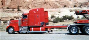 CHOP’S EXTREMELY This month’s Readers And Their Rigs features Paul “Pork Chop” Kramer and his super-long Peterbilt. Paul (40) is an owner operator running under the name Image Specialized Transport, Inc. out of Fort Smith, Arkansas. Currently hauling cars (lease returns) between Indiana and California, Paul has been running trucks since he was seventeen years old. His current ride is the unique 1990 Peterbilt 379 pictured here. Powered by a 3406-B Cat engine and a 15-speed overdrive transmission, this bright red rig has a host of custom features including Harley-style, 6-inch side-pipes, a 330-inch wheelbase, fiberglass front and rear fenders (the rears were added after this photo was taken), hand-cut hood vents, and headlights off of a 1932 Dusenburg automobile, complete with low, medium and high beams. Covered with lights, the tractor has approximately 225 LEDs and the trailer has another 180. Inside the cab, the interior is mostly stock except for some extra gauges and chrome that Paul added to the dash. He also made and installed his own custom shift knob, foot pedals, shift tower plate and a hardwood floor. Much of the work was done years ago, so Paul is planning on redoing some of it in the near future. With its wild side-pipes, the truck has a distinctive sound as it rolls down the road - and rolls it does. This rig has over 2.5 million miles on it, and everywhere it goes, crowds gather to gawk and take pictures. But if you see Paul out on the road, don’t offer him a pork chop. It might be his handle, but he doesn’t even like them. Go figure! We’d like to thank Paul’s close friend Terry Kuhl for taking the time to send us the pictures and letter. |