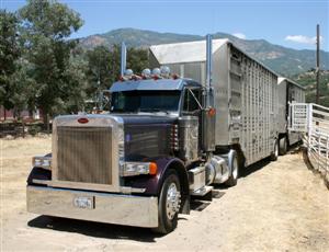 Beek’s This month’s Readers And Their Rigs features Rick Van Beek of Tulare, California. Rick happened to be picking up a load of cows near our editor’s new home in the hills so we went down to meet him. We were surprised to find that he was a huge fan of 10-4 Magazine and that he picks it up each and every month in Goshen, CA and reads it from cover to cover. Rick (46) has been hauling cattle for sixteen years and pretty much has it all figured out. Running under the name Big Valley Cattle, Rick hauls both dairy and beef cows, depending on the season, throughout California’s Central Valley. He primarily stays in the Fresno, Tulare, Kings and Kern counties, but around Thanksgiving, he starts doing runs from the northern part of the state, picking up cows in Cottonwood and bringing them down to the valley where its warm. Cows can’t graze when the ground is covered with snow, so once winter hits, the cows need to be moved to warmer climates. Rick’s truck is a 2001 Peterbilt with a C-15 Cat engine and an 18-speed transmission. The Charcoal Metallic truck with Black Cherry fenders, which has just about every option available, pulls a set of Merritt doubles. These old 1972 trailers are hard to come by anymore, but you can still get them from Merritt if you special order them. Rick needs the doubles because he has to go up into the hills quite often, and those narrow, winding roads are sometimes hard to navigate with a truck and trailer or a tractor pulling a long single trailer. His trailers are 27.5 feet long and feature two levels - appropriately called upstairs and downstairs - and can hold 40 full-grown cows when loaded. When we told Rick that Ed Rocha’s old cattle hauler was going to be on the cover he called Ed a legend and said, “He’s the king.” Our thanks go out to Rick for being such an avid fan of 10-4. Keep reading the magazine and getting those cows down the road in one piece! Copyright