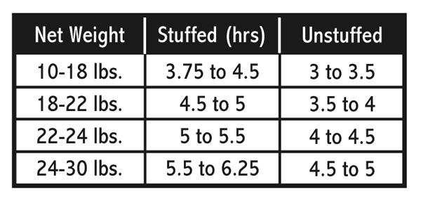 overcooking the breast. Start checking for doneness 1/2 hour before