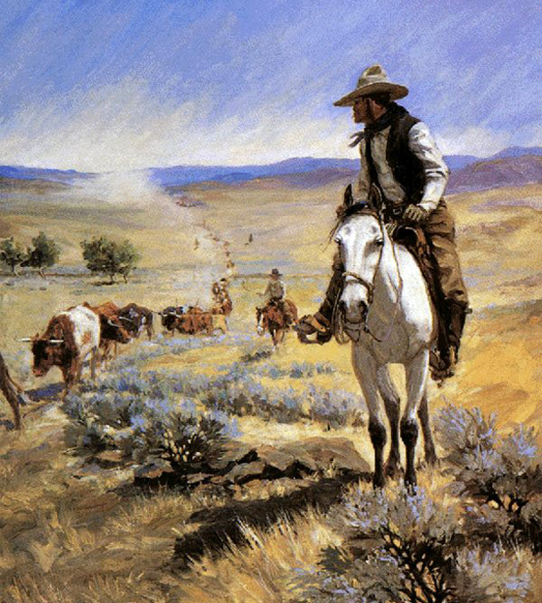The end of the American Civil War ushered in the era of the Wild West cowboys. After the war there was a great demand for beef. Since the supply of eastern beef had been depleted, the nation looked towards the southwest for beef. An estimated 5 million longhorn cattle were roaming wild in Texas, but there was no railhead there to transport them. To overcome this problem, Joseph G. McCoy built stockyards at the railhead in Abilene, Kansas, and then encouraged Texas cattlemen to drive their herds to them. The ranchers began hiring young boys to round up the longhorns, brand them, and get them ready for the long cattle drive. These young boys, who were on average 14 to 18 years old, became the famous cowboys of the Wild West. The cowboys worked from sunup to sundown and only stopped to change horses. After a bland dinner of beans, biscuits and black coffee, most of them went to sleep, using their saddle as a pillow. The rest of the cowboys took turns watching the herd. There was nothing romantic about the cowboys – their life on the trail was filled with broken bones, snake bites and stampedes, not to mention bad weather, dangerous river crossings, saddle sores and poor pay! The herd was spread out over 2 miles and moved about 10 miles a day along the Chisholm Trail. The trail started in Southern Texas (south of San Antonio) and made its way north to Abilene, Kansas. The journey took about 100 days. At the end of the trail, the cowboys would get their pay and hit Abilene for a few days of wicked diversion. After that, they made the 1,000 mile ride back to Texas for the next drive. The first cattle drive on the Chisholm Trail took place in 1867 – the last one was in 1887. The era of the cowboy was short lived, but the legend and lore of the American Wild West still lives on today!