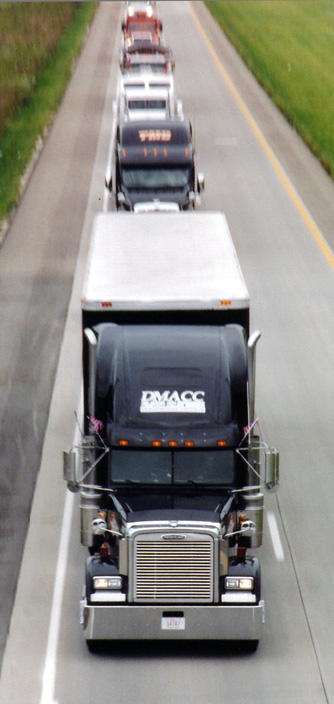 Several Iowa DOT officers were on-hand to help. I talked with three officers, and one of them (all will remain anonymous) told me that they were there to help direct traffic so that no accidents would occur and added, “It’s a wonderful cause.” I thought his perspective was right on when he told me that they (the officers) could have a lot of involvement with the drivers and really enjoy each other’s company - not meeting on an inspection level, but more like friends - all together working for a great cause and helping to keep our highways safe. All the officers I talked to that morning were having a good time and very friendly. I’ve always felt that they have a hard job to do. Sadly, not all trucks are kept up 100%. If they were, we wouldn’t need the DOT. Give them a current log book and have a well-maintained truck, and you’ll get along fine! They could find something we miss. After all, we’re human and trucks are mechanical! Now, on to the really fun stuff: trucks rolling down the road along with the DOT, all having a good time, with air horns blowing and sirens going off - WOW, what a sight!