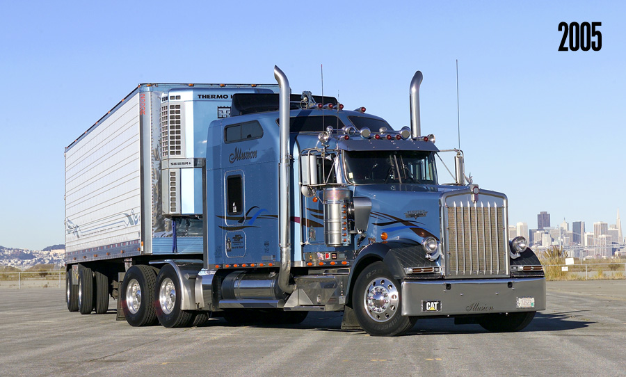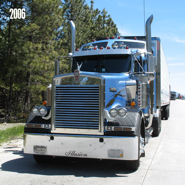 On October 21, 1998 we became the proud owners of a Light Blue Metallic W900 Kenworth we named Illusion. The three trucks that we’d driven prior to this one had been Black and I really wanted this truck to be Black Lilac, but Rod really wanted the light blue. But I also wanted to shave the fenders and add round headlights, so we compromised. I got the hood the way I wanted it and the fenders and the whale tail were painted black, and Rod got the light blue, which was similar to his pickup. And together they’ve worked. There are a few trucks out there this color, but it’s not common. Back then, they had a limited edition celebrating Kenworth’s 75th anniversary, but we decided that we didn’t want a truck that looked like 499 other ones running around the highways.