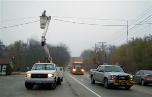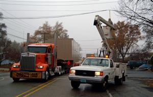 The load in two of the pictures shown here was 16’ 2” high and was recently moved just a short distance within the state of Illinois. It took one day to load it, one day to move it and then one day to unload it. During the move, as seen in the photos, a bucket truck had to stay ahead of the orange Kenworth and an operator inside of the bucket had to actually lift electrical lines and telephone wires along the route so that the load could pass under them safely. Some loads require this on several occasions during a move. The really long loads even have a steerable trailer, meaning that the back can be steered remotely to help get around tight corners. It is just amazing how advanced some of this equipment, used to move this specialized freight, can be.
