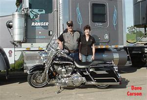 Dave Carson of Wheatland, IA drives a Slate Gray 2007 Kenworth W900L and rides a Black 2003 Harley Davidson Road King. He got this bike during Harley’s 100th anniversary! Dave always rode a Harley. His dad bought him his first bike in 1959 – a 165cc Harley Hummer – that would blow the doors off his friend’s Cushman scooters. His latest bike is the first one that he has ever had that was equipped with a windshield (which was removable if he didn’t like it). But after the first ride with the windshield, all of those previously-buggy trips out west didn’t seem so cool. One night he took it off and rode down a buggy road and decided, “That was enough of that!”