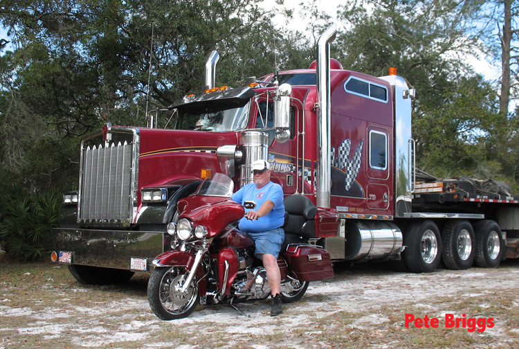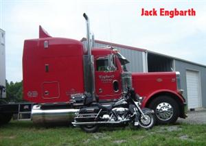 Jack Engbarth of Lincolnton, NC drives a candy apple red 2000 Peterbilt 379 and rides a Jet Black 2005 Harley Davidson Ultra Classic touring bike with a Silver-Green pinstripe. Jack has been a truck driver for 37 years and a motorcycle rider for over 40. The weather is not a factor when Jack rides. In the coldest of winter, he puts on a leather jacket, chaps, a ski mask and a full face helmet to keep warm while he rides. “When I’m not driving the big iron, I’m riding the little iron,” said Jack.