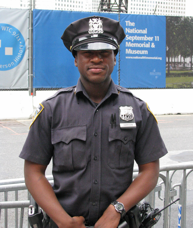 I walked around the block and started talking with NYPD Officer Tim Harrison, a very friendly young man who was happy to answer my questions. Tim was in high school in Long Island on that horrible morning. Upon seeing the burning tower after it was hit, half of the school thought it was just a drunk pilot that flew into the building, but the other half quickly realized what was happening. Once everybody figured out what was really happening, there was a lot crying. Many police officers died in the towers that day partly because of the communication difficulties. I asked him if this issue had been improved since then. He said that things are better, but still not perfect. They now have routine drills to be better prepared for another disaster, if one ever does happen again. He also told me that for the last two years, the NYPD has become all one department with different divisions, instead of all being separate, like they used to be. Everyone still goes through the same academy, but the traffic police don’t carry guns – just meters and ticket books. All of the officers that carry guns also carry gas masks now.