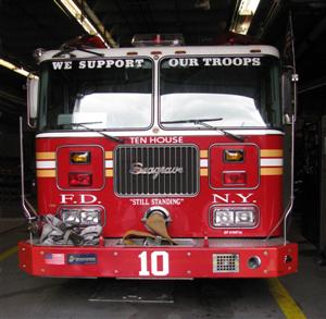 Unfortunately, Fire Station 10 was closed, but I did get to talk with a woman who was standing in front of it, like me, wanting to talk to the firemen inside. She had brought patches from her fire station in Seattle, WA to exchange with these guys. I didn’t get to talk to any of the firefighters at Station 10, but the door was open and one firefighter there let me take pictures of the fire truck and their memorial wall in the station, honoring the firefighters from that “house” that were killed on 9/11. We all talk about the brave firefighters, police officers and other innocent people that died that day, but it hit closest to home for these guys, as their station is located right across the street from the WTC site.