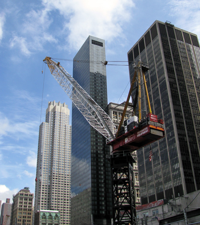 On Thursday, after dealing with our deliveries, I decided to brave the subway and go to Ground Zero. Grand Central Terminal is something to see in itself! The lady police officer I talked to not only told me what train to take but she let me have her map, too. When I got off the subway at Fulton Street, it was easy to see the gaping hole in the skyline where the towers once stood. Fencing surrounds the construction site of One World Trade Center, which is the new tower that is finally under construction (some call it the Freedom Tower). Not much has been accomplished at the site over the last eight years, but there is now a master plan in place that includes several skyscrapers with office space, restaurants and shops, a performing arts center, a memorial and a large transportation hub. When completed, this new business center, especially the new 1,776-foot-tall tower (Tower 1), will once again redefine the New York skyline.