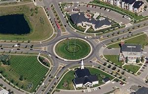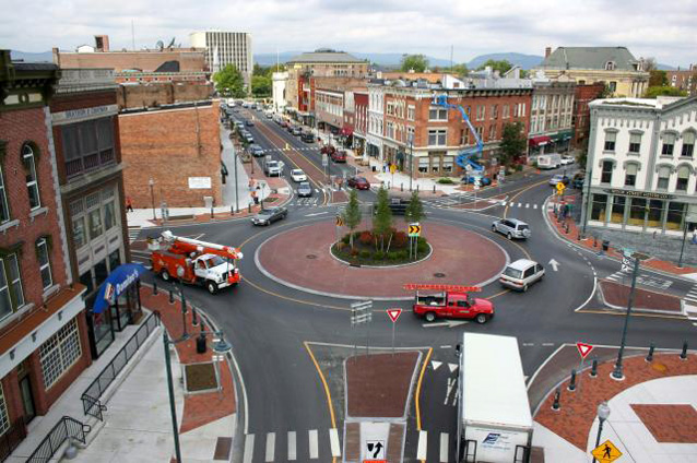 Recently in Syracuse, New York, I went around a huge roundabout that was very car and truck friendly. Since one of the entrances into this circle was off I-90, it had actually been designed for trucks. Another roundabout designed with trucks in mind is in St. George, Utah at exit 4 off of I-15. Since that is the exit for the Flying J Truck Stop located nearby, it carries a lot of truck traffic and has been designed accordingly – the lanes are wide enough and the curbs are low so it is easy to get around the nicely landscaped center island.
